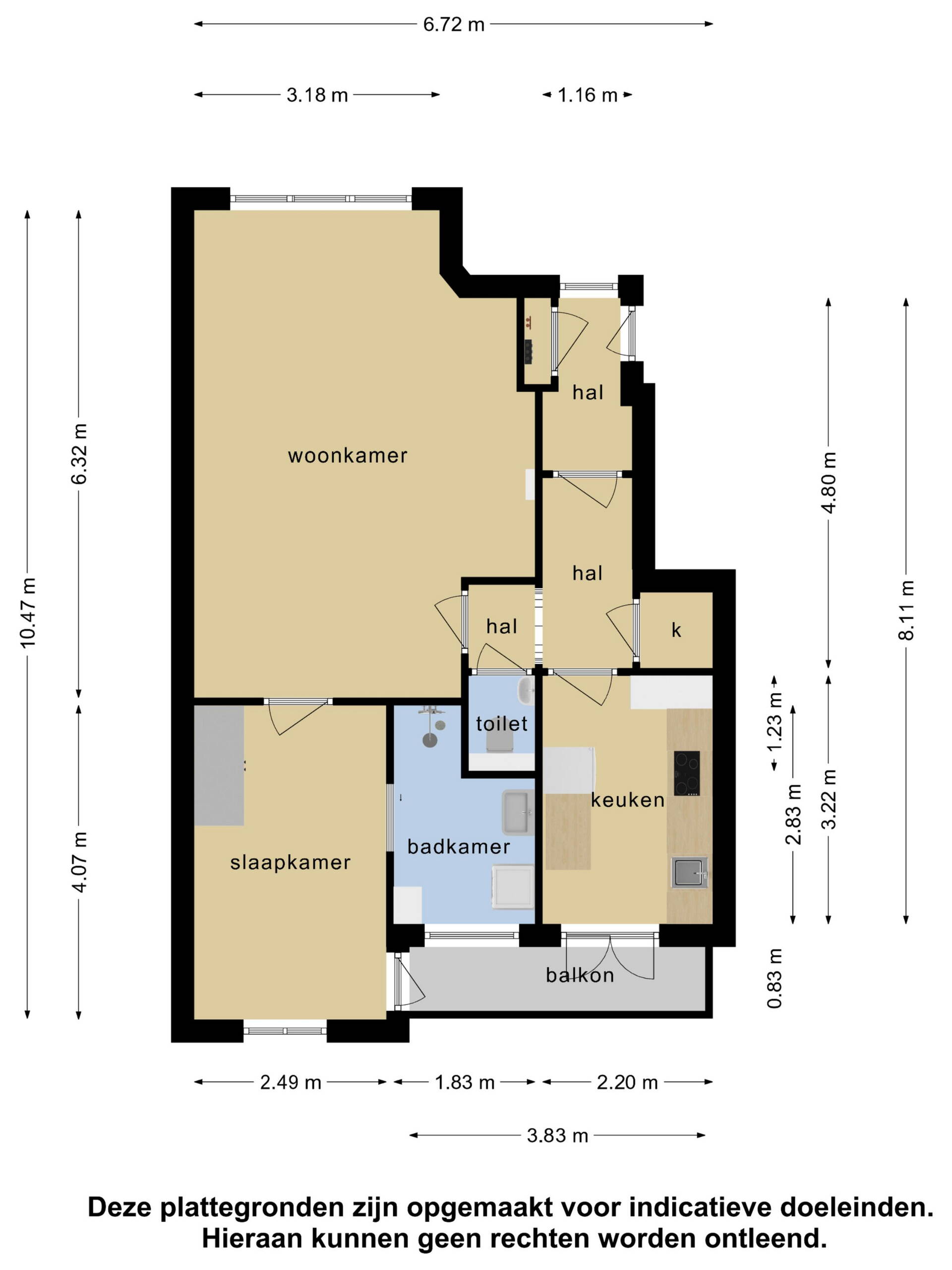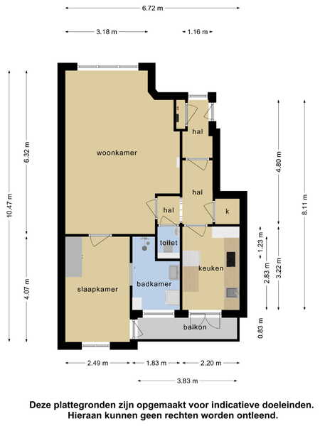 Via trappen naar de eerste verdieping is de voordeur te betreden van waaruit je binnenkomt in een hal. Deze hal geeft doorgang naar nog een hal welke toegang biedt tot een toilet, woonkamer en keuken.