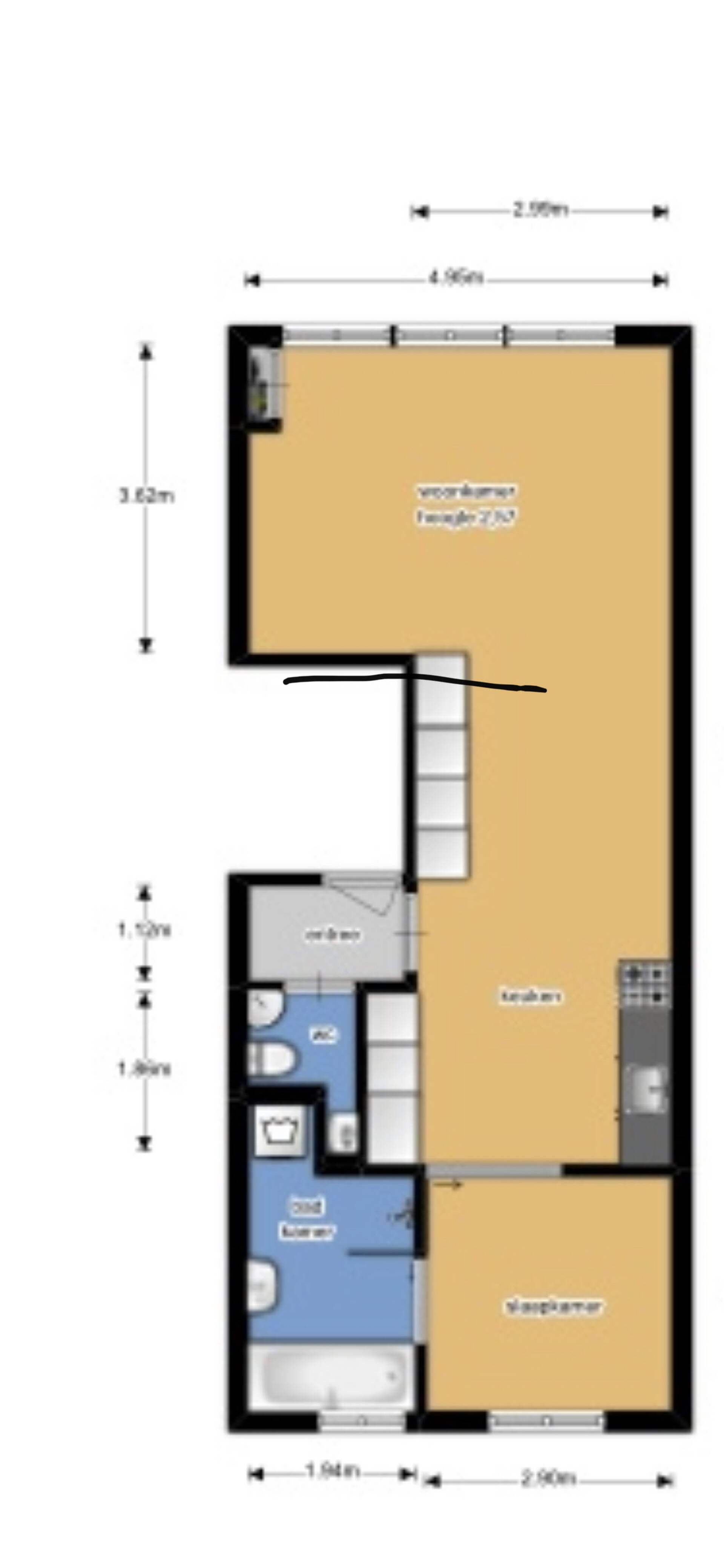 via communal staircase (shared with upper appartment) you reach the apartment on the first floor. Nice and modern kitchen equipped with appliances such as a dishwasher, oven, extractor, fridge-freezer. The living room at the front (street side) has 3 large windows and houses the lounge area. The bedroom with en-suite bathroom is at the backside and accessibele via characteristic sliding doors. The bedroom has a double bed. The bathroom has a bathtub, single vanity, and a shower. Toilet is separate.