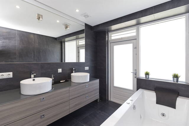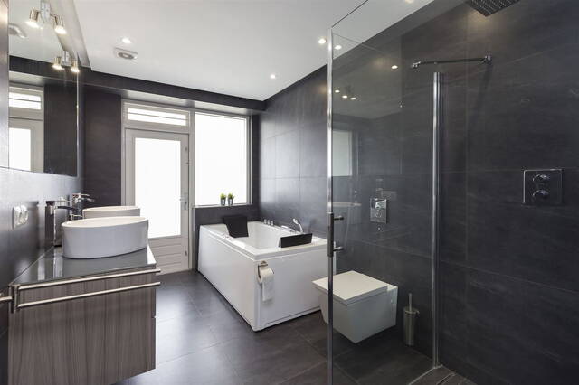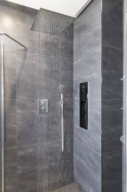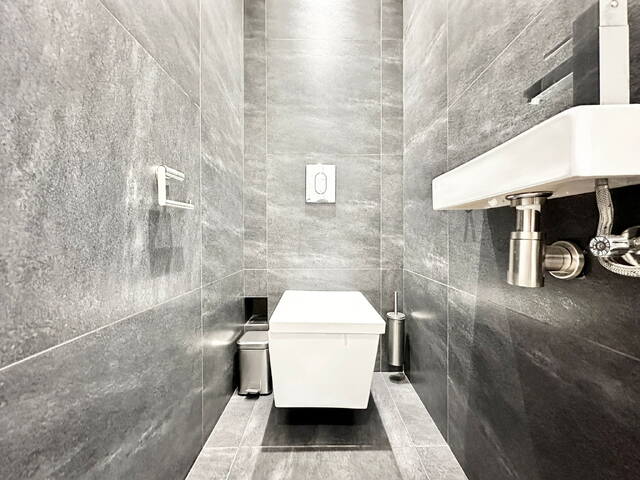 The luxurious bathroom invites you to unwind, with a generous bathtub, a walk-in rain shower, a double sink, and a toilet. There's also a separate guest toilet accessible from the hallway.