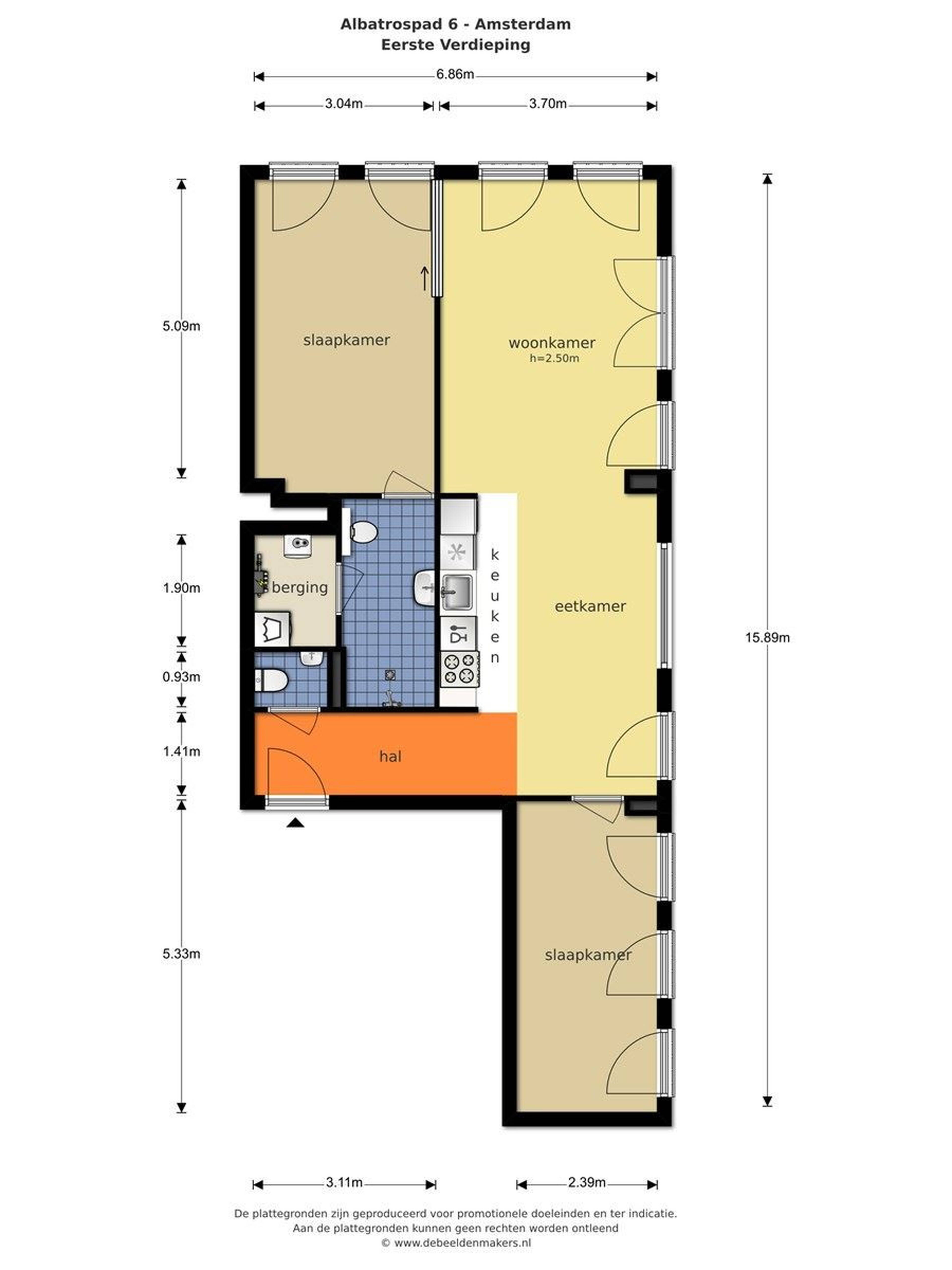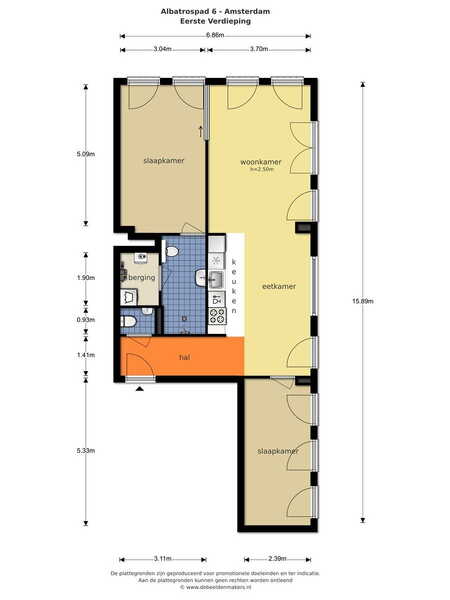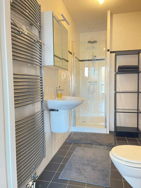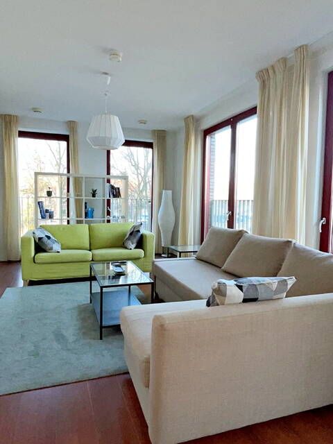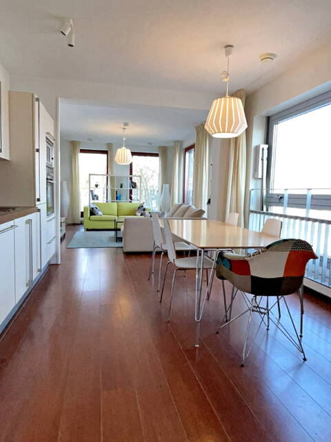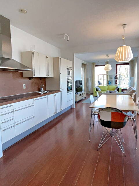 Via de afgesloten gezamenlijke entree bereikt u met de lift de eerste verdieping. U komt binnen in de hal met video-intercom en een apart toilet/doucheruimte. Aan de linkerzijde bevindt zich de eetkamer met open keuken. De keuken is uitgerust met een oven, koelkast, keramische kookplaat met afzuigkap en een vaatwasser. Door de hoekligging en de vele grote ramen is het appartement zeer licht en zonnig aan het einde van de dag. Dit komt mede door de openslaande ramen met een luxe draai-/kiepsysteem, waardoor u als het ware uw eigen buitenruimte creëert. Aan de rechterzijde van de entree bevindt zich een (slaap)kamer. De tweede slaapkamer, met een en-suite badkamer voorzien van douche, toilet en wastafel, ligt aan de achterzijde van de woonkamer.