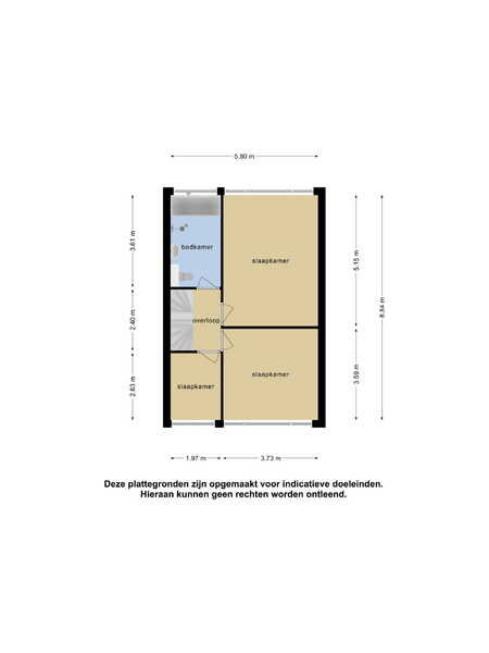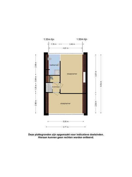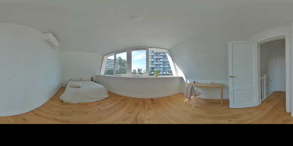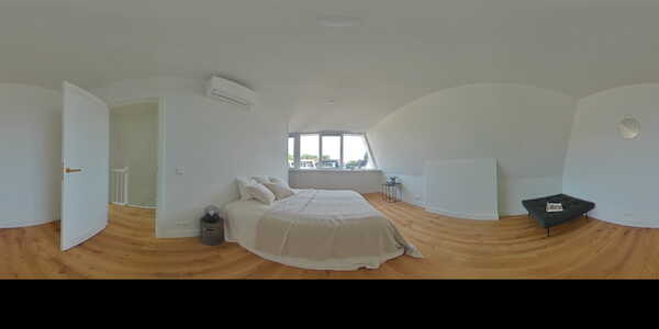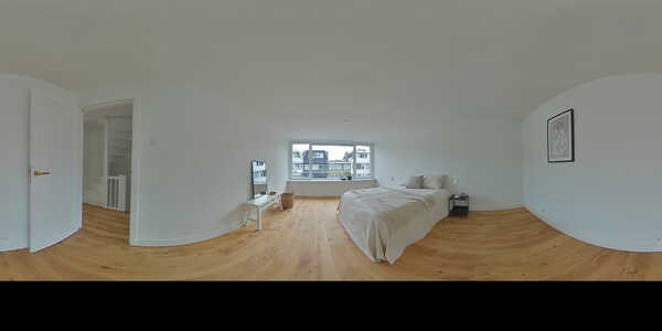 Boven op de eerste overloop tref je 2 riante slaapkamers aan, een werkkamer en de eerste luxe badkamer. De slaapkamer aan de achterzijde van het huis is het grootst, maar ze ontlopen elkaar niet veel. Alle kamers zijn voorzien van dezelfde strakke witte muren en eenzelfde houten vloer als de begane grond.