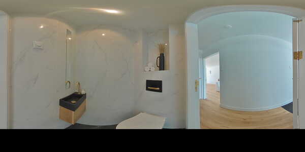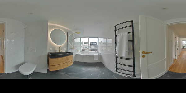 The bathroom is beautifully luxurious and stylishly decorated with natural stone on both the floor and the walls, bathtub, a spacious walk-in shower with rain head, floating toilet and a designer sink. In addition, all taps have a gold finish.