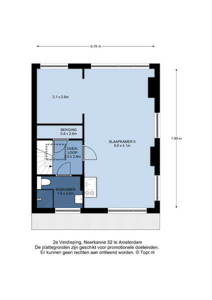 Tweede verdieping: de opbouw dateert van 2007 en mocht destijds 8 meter diep worden vergund. Deze etage bestaat uit een grote ruimte en een aparte badkamer. Deze badkamer is voorzien van douche, wastafel en wc. De mogelijkheid bestaat om de 2e etage op te delen in 2 a 3 (slaap)kamers of er een grote master-bedroom met walk-in-closet van te maken. De keuze laten wij graag over aan de nieuwe eigenaar. Alle ramen op deze etage zijn van hout met goede isolerende beglazing. Boven de overloop/trappenhuis komt middels dakkoepel natuurlijk licht binnen.