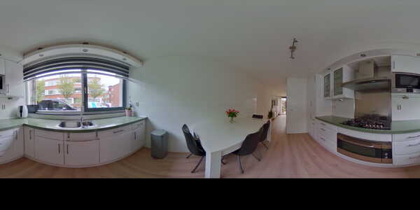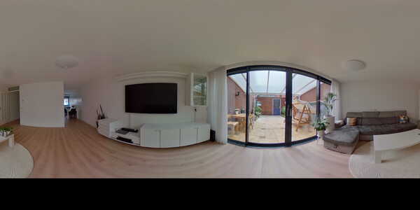 De gehele woning is heerlijk licht en goed onderhouden, zo ook de ontvangsthal. Van hieruit kan je naar het toilet, de trap naar boven pakken of naar de woonkamer. Als contrast op het wit is er in de woonkamer een prachtige zwarte schuifpui geïnstalleerd waarmee je het overdekte terras op kunt. Aan de voorzijde van het huis is de luxe open keuken gelegen, volledig voorzien van moderne inbouwapparatuur en stijlvol afgewerkt met een grijs/groen stenen werkblad.
