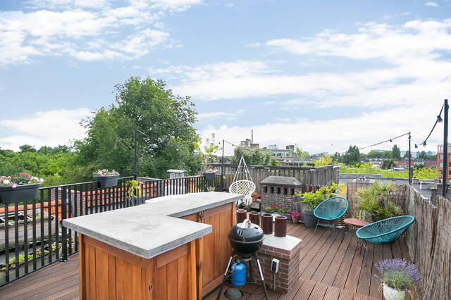De grote verrassing en unieke van deze woning is toch wel het riante dakterras! Hier kun je tot in de late uurtjes genieten van de zon en zonsondergang. En het uitzicht? Die is geweldig! Zo kijk je uit over de Amsterdamse daken én het Vondelpark. Zie jij jezelf hier al tafelen of loungen? De lichtkoepels in de woonkamer fungeren ook als vloerlicht voor het dakterras, waardoor het er tot laat in de avond goed te toeven is. De ingang naar het dakterras bevat een kleine glazen overdekking met een mooi formaat bank om te lezen of koffie te drinken op die winterdagen dat je natuurlijk licht wilt maar het te koud is om naar buiten te gaan.