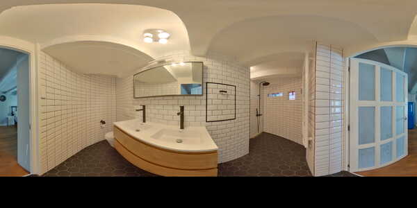 The sleeping area is characterised by lots of light and French balcony doors. The bathroom has a unique design with its round walls. It is modern and designed entirely according to trend with white metro tiles on the wall and black hexagon tiles on the floor. Here you have a floating toilet, rain shower and double sink in beautiful furniture.