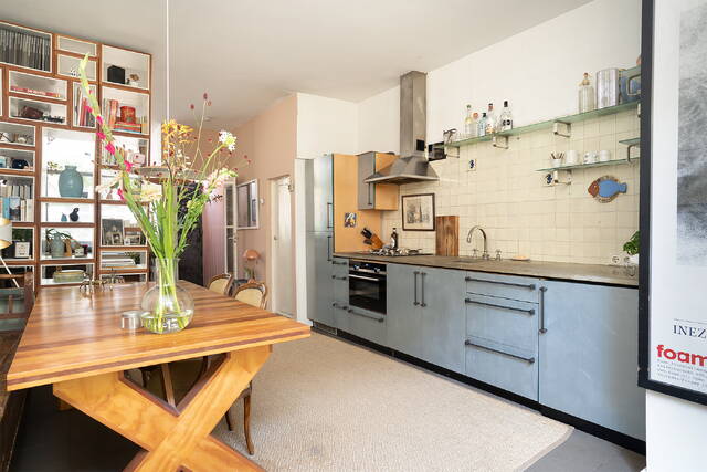 Richting de achterzijde van het huis kom je als eerste langs de eetkamer en open keuken. De keuken is op maat gemaakt door een werkplaats in de Pijp voorzien van een lang, beton gegoten aanrecht. De deurtjes zijn van hout met zinken frontjes, en de minimalistische zwarte grepen zijn van zwart ijzer, ook weer op maat gemaakt door een las studio in de Pijp. Deze industrieele look wordt afgewisseld met een klassieke glanzende tegelwand. Daarbij is deze keuken uitgerust met een gas plaat van SMEG, een afzuigkap, koel/vriescombinatie van AEG, combi heteluchtoven/ magnetron van SIEMENS.. De grote openslaande deuren voorbij de keuken bieden hier toegang tot de achtertuin.