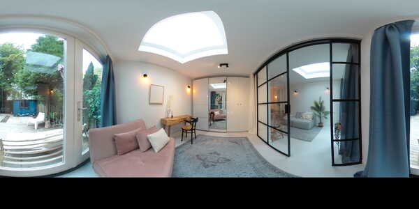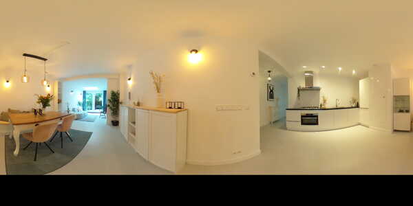 The covered main entrance gives access to this modern ground floor flat. From the hall with the meter cupboard, you step into the house. The living room is a beautiful, open space with lots of natural light thanks to the double doors to the garden and the skylights in the extension. The living room offers enough space for a living room and a dining room near the open kitchen. The sleek, white kitchen has recently been completely renovated and equipped with all modern appliances, including an AEG 5-burner gas hob, extractor hood, AEG combination oven, dishwasher and fridge/freezer. Thanks to the practical placement of the kitchen, it beautifully blends into the room. The property features ee bedroom on the street side. The bedroom is wonderfully spacious and with its beautiful stained-glass windows particularly attractive. On the garden side, a second, garden-oriented bedroom/study can be created. The luxurious, new bathroom is tiled in neutral colours and equipped with a walk-in shower, bathtub, toilet and washbasin with double washbasin. The washing machine connection is neatly hidden in a built-in cupboard in the hallway. There is a sleek, luxury cast floor throughout the flat and the entire house has comfortable underfloor heating.