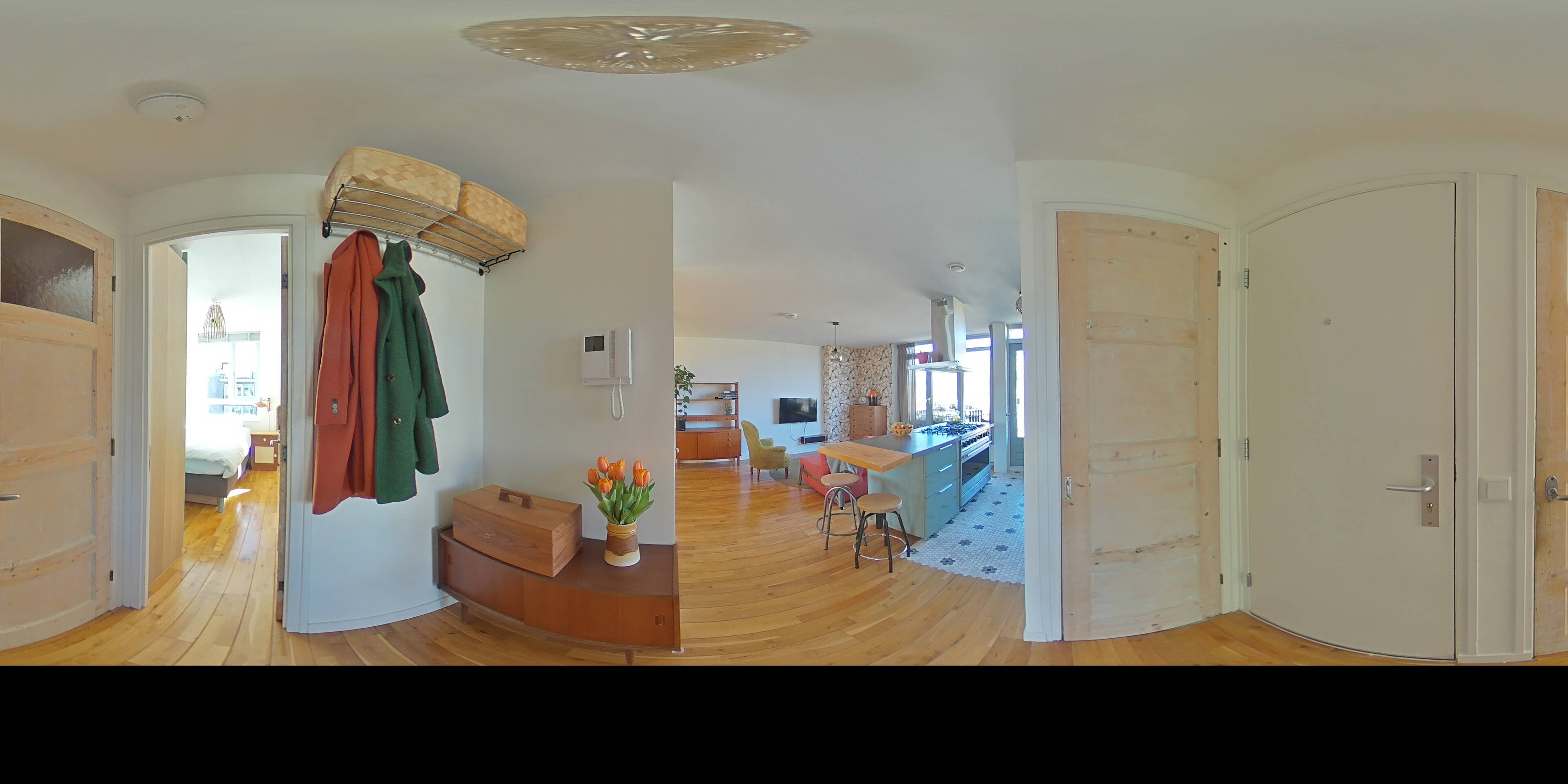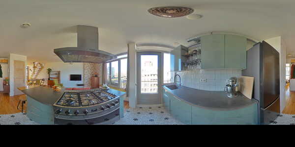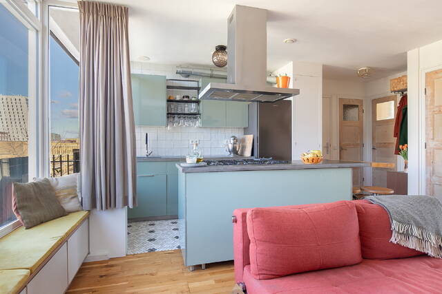 In de open leefkeuken tref je een mooie tegelvloer, kookeiland, turquoise keukenkasten met chromen handvatten en een betonnen keukenblad aan. Tevens is de keuken voorzien van een 6-pits smeg gasfornuis, afzuigkap en koel/vriescombinatie. Hier kook je met prachtig uitzicht over de Erasmusgracht! Vanuit de keuken sta je zo op je balkon met avondzon.