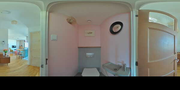 In de frisse badkamer vind je een combinatie van witte en groene wandtegels met een originele granito vloer. Verder is de badkamer voorzien van een inloopdouche en bamboe wastafel in meubel.