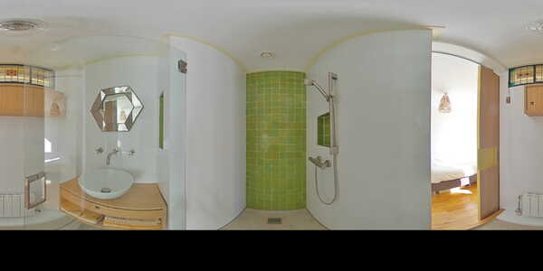 In the fresh bathroom you will find a combination of white and green wall tiles with an original granite floor. Furthermore, the bathroom has a walk-in shower and bamboo sink in furniture.