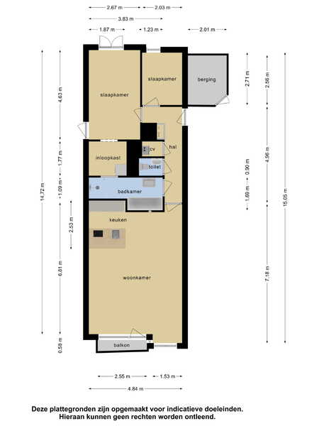 Het appartement is via een hofje te betreden van waaruit je binnenkomt in een hal. Deze hal leidt naar twee slaapkamers, een separaat toilet, badkamer en woonkamer.