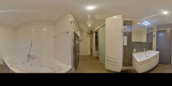 De moderne badkamer is voorzien van een heerlijk bubbelbad, schitterende lichtspots, een wastafel in meubel en inloopdouche met regendouche en glazen tussenwand. Daarnaast vind je in de badkamer een combinatie van lichte en donkere wandtegels met een donkere tegelvloer. Je kunt vanuit de badkamer een inloopkast betreden.