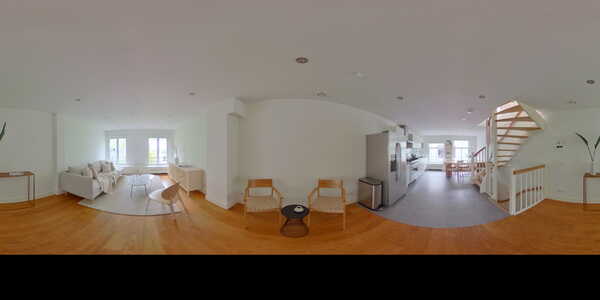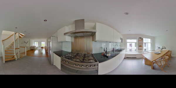 Here is the spacious, bright open kitchen with high quality appliances. The kitchen is fully equipped with a large fridge / freezer, a spacious oven with a 6-burner stove and a dishwasher. The living room at the rear has high windows with lots of light. There is a beautiful authentic wooden floor here.