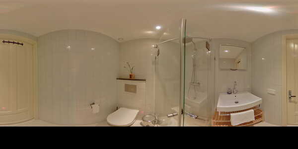 De badkamer op deze verdieping is volledig betegeld en voorzien van een inloopdouche, wastafelmeubel en toilet.