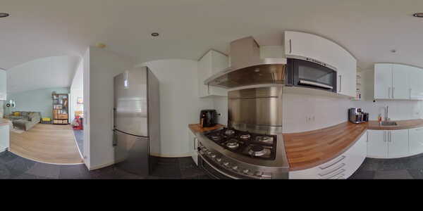 De keuken is modern en neutraal ingericht met witte keukenkasten en een houten werkblad. Je hebt hier alle benodigde apparatuur, zoals een gasfornuis, oven, vaatwasser en inbouwapparatuur, om heerlijke maaltijden te bereiden.
