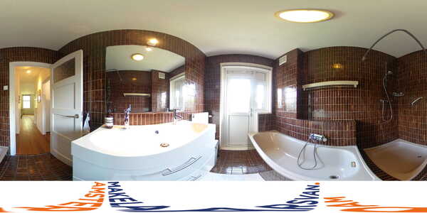 The bathroom, in addition to a bathtub and a shower, also has a double sink unit. Through the windows and the door to the balcony, there is plenty of daylight early in the morning.