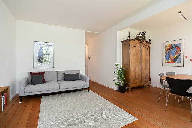 The living room, with its spacious layout and large windows, has plenty of natural daylight. Here, a second bedroom or a study could easily be created. There is more than enough space for a seating area and a dining table, so you can invite family and friends for a cosy dinner.