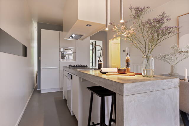 De moderne leefkeuken is voorzien van alle benodigde inbouwapparatuur. Een gasfornuis met afzuigkap, ingebouwde koelkast, vaatwasser, combi-oven en spoelbak maken koken een waar genoegen. Het eiland met zitgedeelte biedt extra functionaliteit en gezelligheid. De betonlook van het aanrecht geeft de keuken een luxe uitstraling.