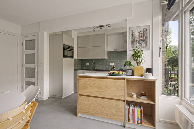 De woonruimte met open keuken straalt licht en ruimte uit dankzij grote raampartijen aan de voor- en achterzijde. Met twee inbouwkasten is er voldoende opbergruimte, en je hebt de mogelijkheid om zowel een gezellige zit- als een grote eethoek in te richten. De grote, open keuken is voorzien van een licht keukenmeubel en hoogwaardige apparatuur. Vanuit de keuken heb je toegang tot het balkon aan de voorzijde, waar je heerlijk van de middag- en avondzon kunt genieten. Aan de achterzijde, bij de zithoek, is de toegang tot het tweede balkon met een zitje en de trapafgang naar de tuin.