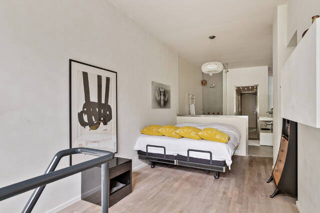 The bedroom offers a quiet place to retreat and is spacious enough for a king-size bed. There is ample closet space in the walk-in closet in the basement for all your personal belongings. If you need additional space, it is easy to create a second bedroom, for example, as a guest room or home office.
