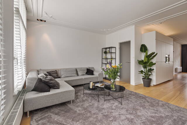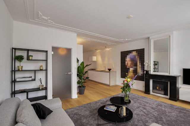 Bij binnenkomst word je meteen verrast door de prachtige eikenhouten vloer die door het gehele appartement ligt. De ruime bergkast in de hal biedt niet alleen plaats aan je wasmachine en droger, maar ook aan de meterkast. Vanuit de hal loop je door naar de lichte en royale woonkamer. Hoge plafonds met sierlijsten en plafondhoge ramen zorgen voor een prachtige lichtinval. Via de balkondeur stap je eenvoudig naar buiten om even te genieten van de frisse lucht. De woonkamer vormt samen met de keuken en eetkamer een prachtige open leefruimte. De twee authentieke schouwen in de woonkamer en eetkamer, gecombineerd met de moderne open keuken, zorgt voor een speelse balans tussen klassiek en eigentijds.
