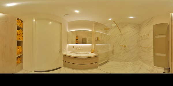 De badkamer is modern en stijlvol afgewerkt met een ruime inloopdouche, een wastafel en een opbergmeubel in een luxe marmerlook. Daarnaast beschikt de woning over een separaat toilet en een praktische berging met aansluitingen voor witgoed.