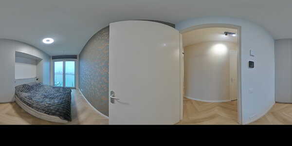 De ruime slaapkamer biedt een rustige en comfortabele plek om te ontspannen. Ingebouwde kasten zorgen voor een praktische indeling en de grote ramen zorgen voor veel natuurlijk licht.