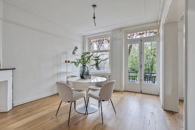 Zodra je de statige gevel aan het Surinameplein ziet, weet je: dit is geen dertien-in-een-dozijn woning. Het appartement op de tweede verdieping strekt zich royaal uit over 77m² en ademt ruimte en licht, waardoor het meteen een open en uitnodigend gevoel geeft. Dankzij de royale breedte en hoge ramen baadt de woning van voor tot achter in natuurlijk licht vanaf zonsopgang tot het gouden uurtje.