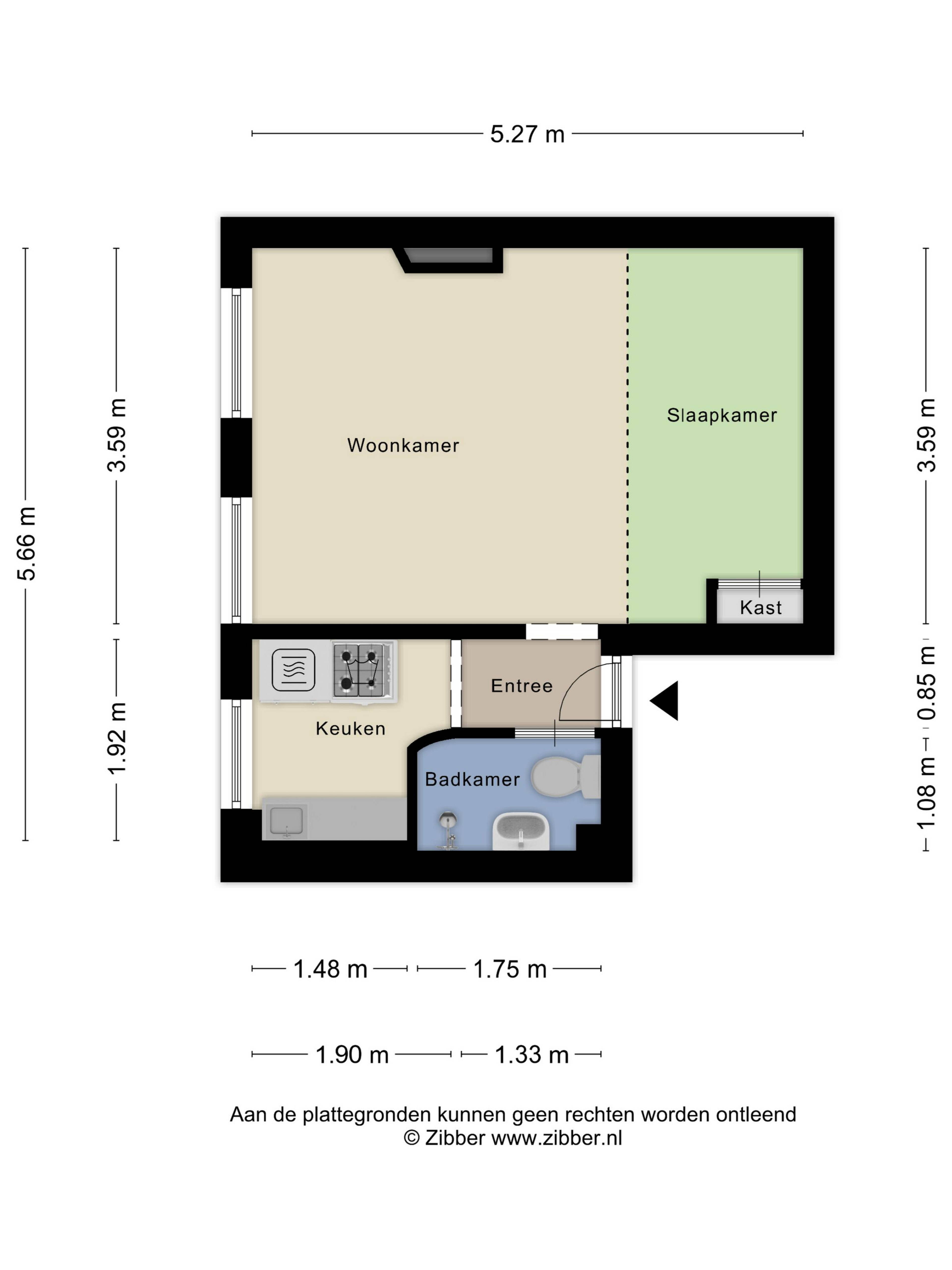 Eenmaal binnen kom je in de hal, vanwaar je toegang hebt tot alle ruimtes. De woonkamer aan de voorzijde is licht en uitnodigend, dankzij de grote raampartijen die uitkijken op de gezellige straat. Hier is ruimte voor een zithoek én een eettafel. Een slaaphoek kun je bijvoorbeeld slim afscheiden met een kastenwand, waardoor je een knus en afgeschermd slaapgedeelte creëert met ruimte voor een tweepersoonsbed.