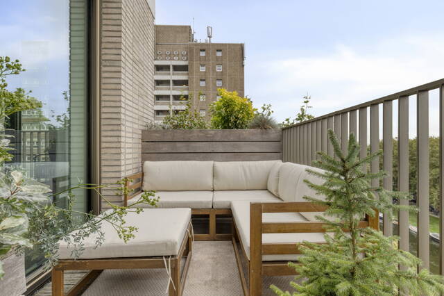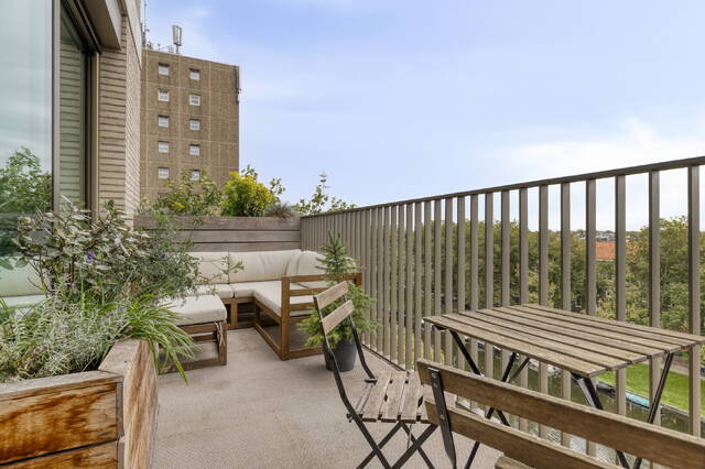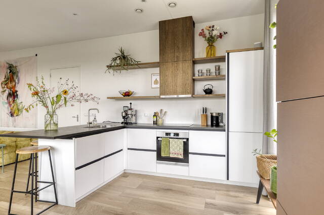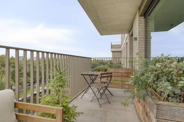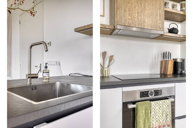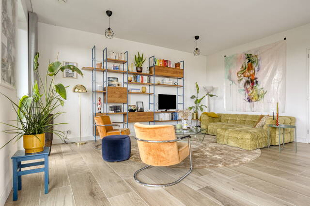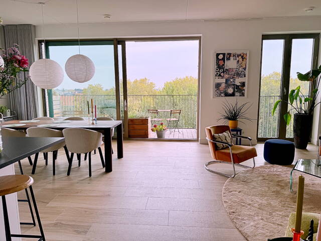 De drie meter hoge ramen geven de woning niet alleen een indrukwekkend gevoel van ruimte, maar ook een overvloed aan daglicht. Vanaf het grote balkon op het oosten kijk je uit over de stad en de groene omgeving, een uitzicht dat elke dag weer verrast. Of je nu ’s ochtends je eerste kop koffie drinkt in de zon of ’s avonds nog even de frisse lucht opsnuift, dit balkon voelt als een verlengstuk van je woonkamer.