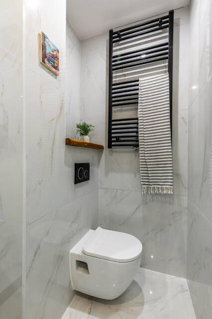 en een ventilator met timer. Het toilet bevindt zich in de badkamer en is in dezelfde moderne
