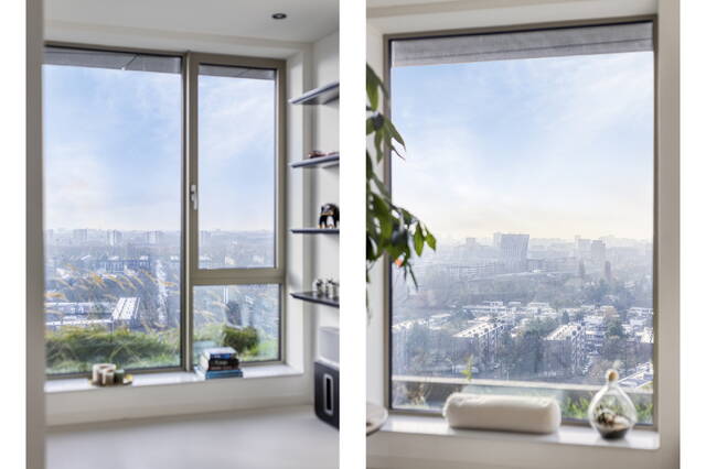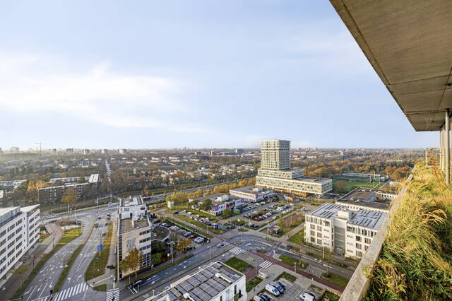 Gelegen op de 13e verdieping van het duurzame en recente Vertical East (2023), voelt dit hoekappartement direct bijzonder. Het eerste wat opvalt? Het enorme glasoppervlak en het indrukwekkende uitzicht dat zich uitstrekt van Schiphol tot Amsterdam-Noord. Overdag zie je de stad leven, ’s avonds verandert alles in een zee van licht.