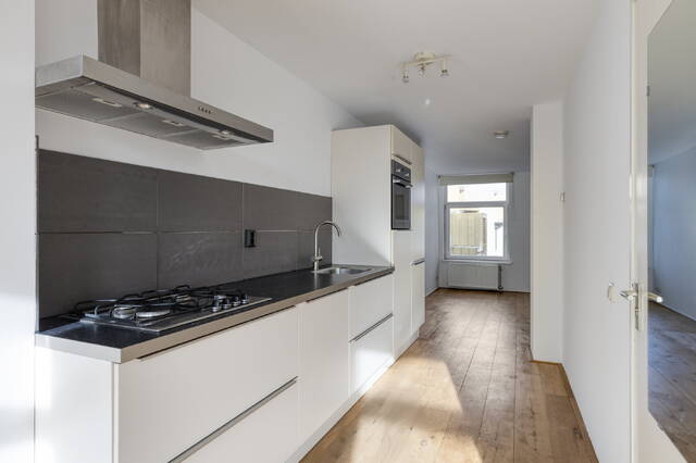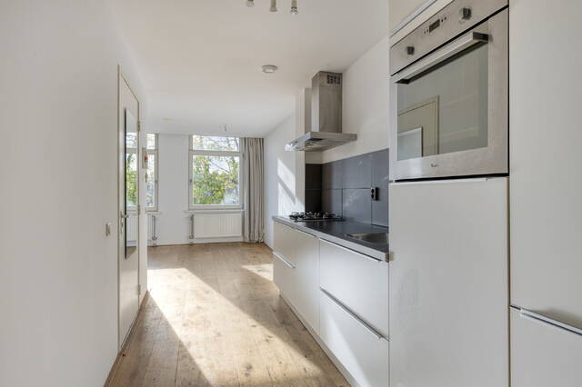 De studio ligt op het zuidwesten, waardoor je in de middag en vroege avond wordt getrakteerd op een warme gloed die door de ramen naar binnen valt. Perfect voor een rustige avond op de bank of een productieve thuiswerkdag met goed licht. In de zomer kunnen de ramen lekker open en hoor je het zachte ritselen van de bomen langs de kade. De keuken is praktisch en ruim opgezet, met volop kastruimte en een fijne indeling voor wie graag kookt of simpelweg van een nette, functionele ruimte houdt.