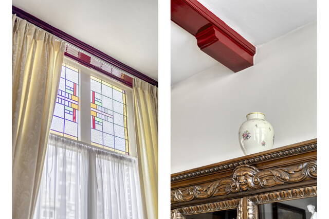 Rich character: stained-glass windows, wooden beams, original tile floor
