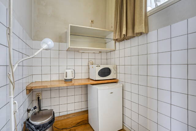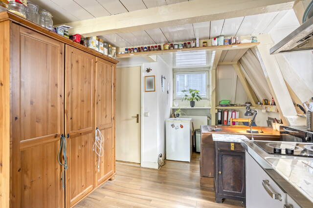 De aangrenzende keuken beschikt over een klein kookstel met inductiekookplaat, spoelbak en biedt plek voor een losstaande koelkast. Desgewenst kan de keuken gemoderniseerd worden om aan uw woonwensen te voldoen.
