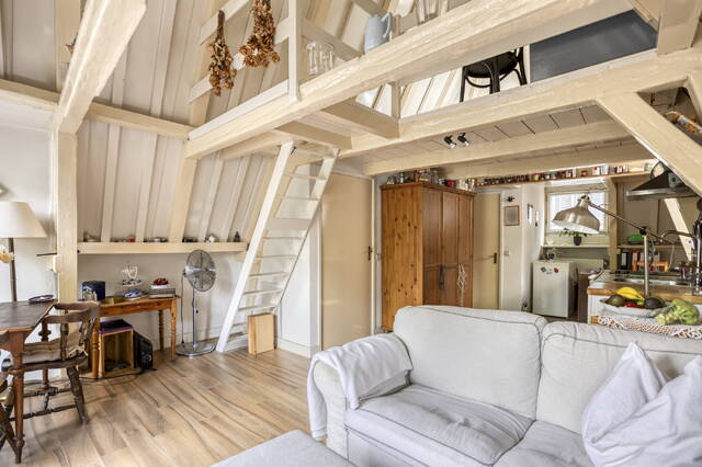 Een trap leidt naar de vide, waar het slaapgedeelte zich bevindt. Hier slaapt u in de punt van het dak, met een uniek uitzicht over de binnenstad van Amsterdam.