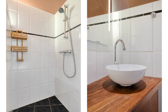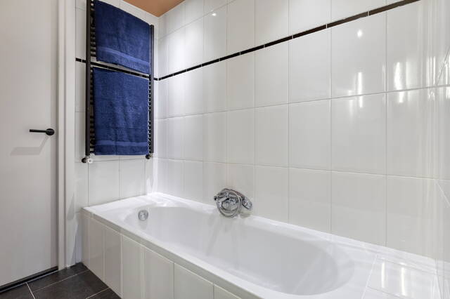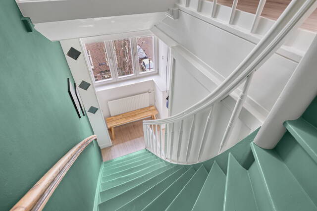 Entree via het trappenhuis op de derde verdieping. Hier bevindt zich de hal met trap naar de vierde verdieping. Op de vierde verdieping vind je de ruime en lichte woonkamer met open keuken, een moderne badkamer met ligbad én inloopdouche en twee slaapkamers. Vanuit de tweede slaapkamer bereik je via een vlizotrap het royale dakterras – de perfecte plek om te genieten van zon en uitzicht.