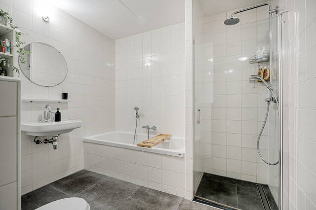 The bathroom is spacious and neatly finished. Its practical layout, calm appearance and comfortable dimensions create a functional space where you can start and end your day with ease.