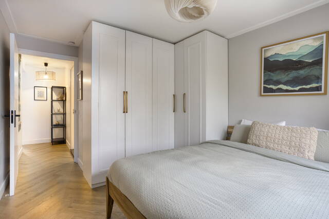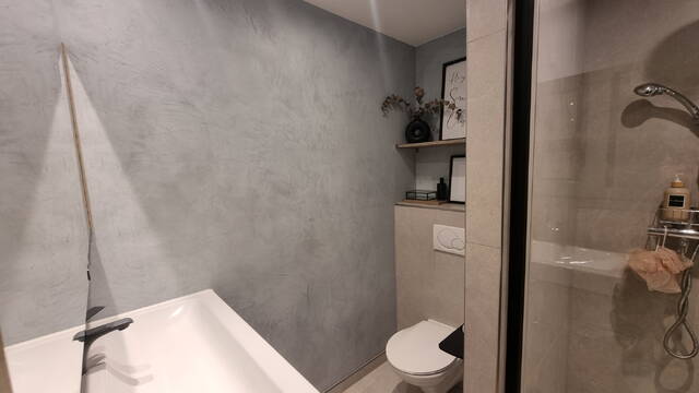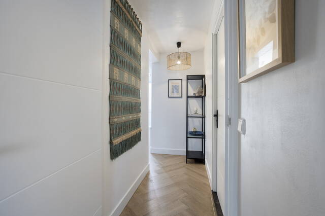 The 2021 renovation included a new kitchen, bathroom, upgraded installations, and high-end finishes. The partial underfloor heating (entrance, kitchen, and hallway) ensures year-round comfort, while the 2023 herringbone floor adds visual harmony throughout the living space.