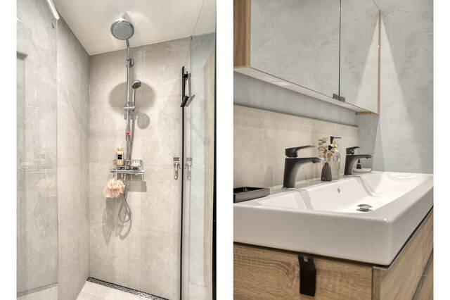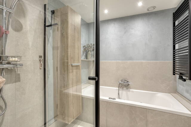 De twee goed bemeten slaapkamers bieden volop flexibiliteit: ideaal als hoofdslaapkamer, logeer- of werkkamer, of voor een stel/klein huishouden. De ruime badkamer is luxe uitgevoerd met een ligbad, regendouche, brede dubbele wastafel en veel bergruimte, een echte wellnesshoek in huis.