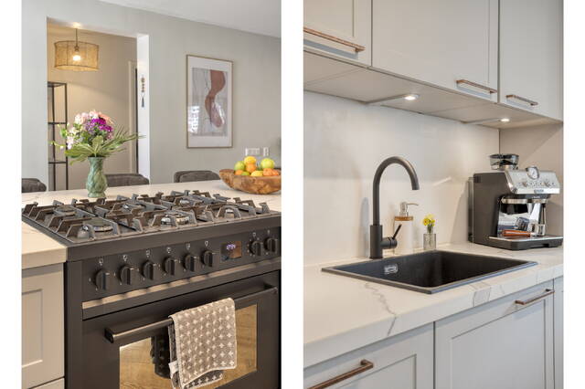 At the heart of the home lies a striking open kitchen with a large island and premium appliances, including the Steel Cucine Enfasi ‘All Black’ gas stove. The kitchen flows naturally into the bright living and dining area, creating a stylish and functional space for both daily life and entertaining.
