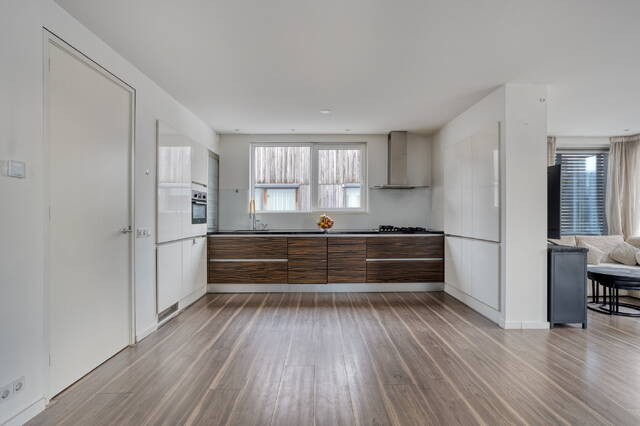 Binnenkomen doe je via een nette entree met toegang tot het trappenhuis en een praktische berging/bijkeuken met technische installaties. De luxe open keuken is volledig uitgerust met moderne inbouwapparatuur en vormt het hart van het huis: koken, tafelen en leven lopen hier vanzelf in elkaar over.