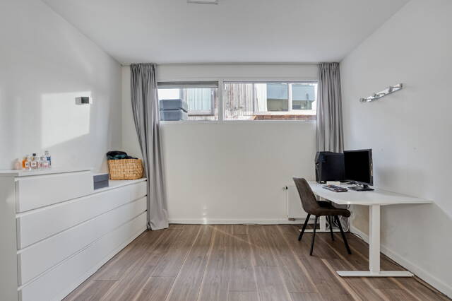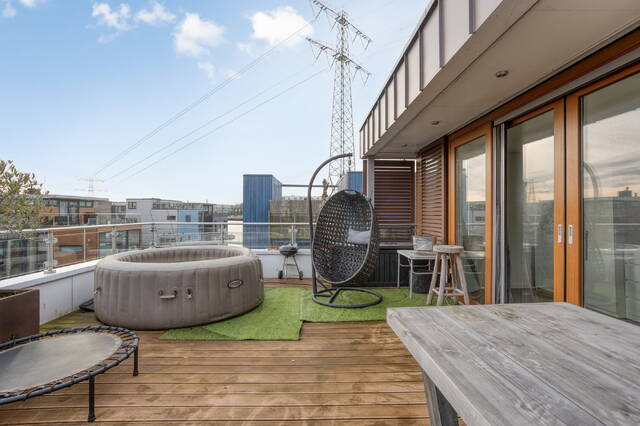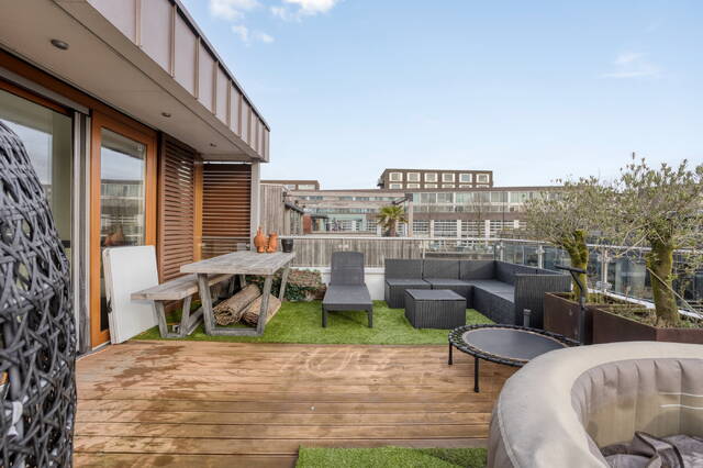 Op de bovenste woonlaag vind je een royale slaapkamer die direct grenst aan het riante dakterras: een plek voor koffie in de ochtendzon, een boek in de middag en een glas wijn bij zonsondergang. Daarnaast is er een tweede badkamer met een ligbad met bubbelbadfunctie, wastafel en toilet. Een fijne, rustige verdieping met een luxe hotelsfeer.