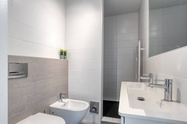 The bathroom on this level is luxuriously finished and equipped with a walk-in shower, bidet and double washbasin, offering both practicality and comfort.