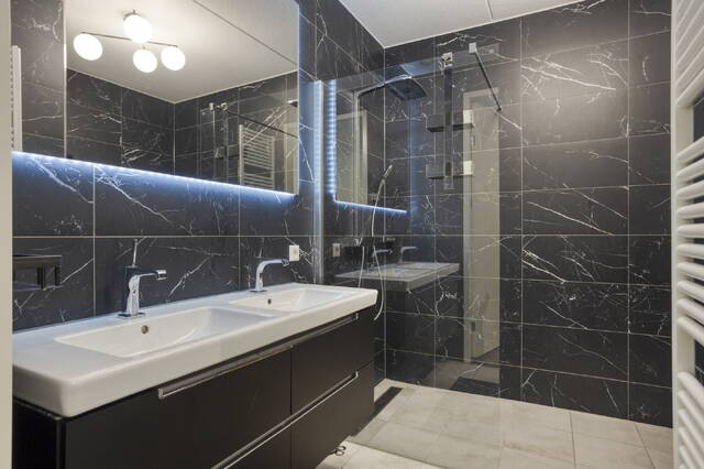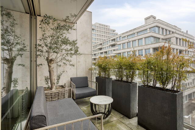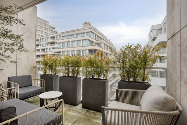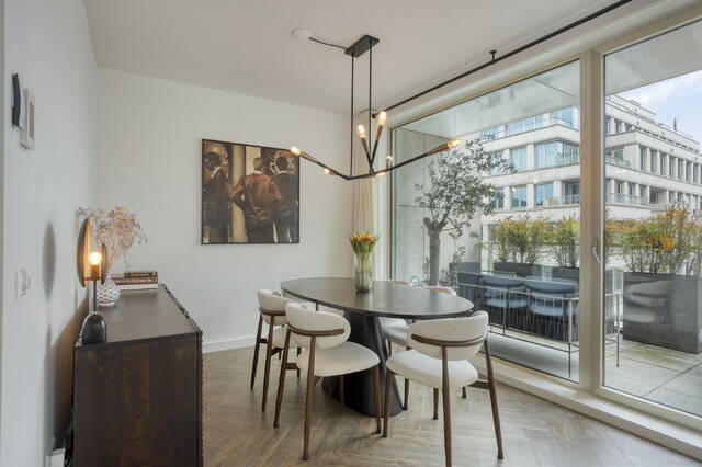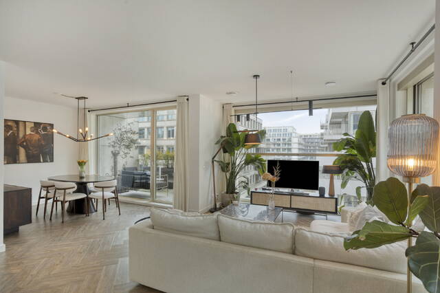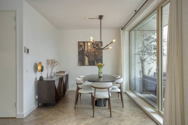 The corner position and four electrically operated floor-to-ceiling windows, which open fully downwards with a tilt function, provide an exceptional amount of natural daylight and a wide, open view of the surroundings. The corner location also means minimal noise from neighbours, and the triple glazing ensures an extra quiet and well-insulated home. Even in summer the apartment stays comfortable: the underfloor cooling system and outstanding insulation keep the heat out, and the electric sunblinds, fitted as an upgrade, do the rest. Underfloor heating runs throughout the entire apartment, powered by a heat pump with heat recovery system.