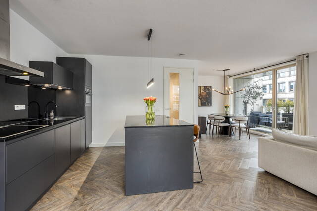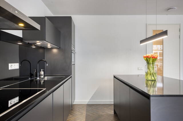 De ruime woonkamer profiteert optimaal van de grote raampartijen en gaat naadloos over in het beschutte balkon op het zuidwesten, een plek waar je ook bij minder mooi weer heerlijk buiten zit. De keuken is als meerwerk voorzien van een keukeneiland, ideaal voor koken en samenzijn tegelijk, en uitgerust met een Siemens-inductiekookplaat, een Pelgrim afzuigsysteem met plasmafilter voor optimale luchtfiltering, en een combioven. Wie thuis werkt, heeft ook in de woonkamer ruimte voor een vaste werkplek.