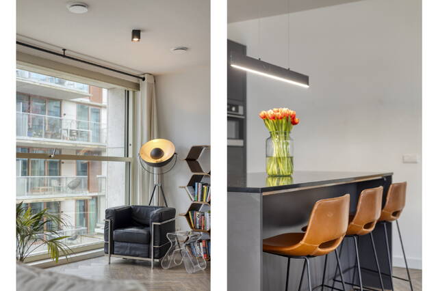 De hoekligging en de vier elektrisch bedienbare ramen van vloer tot plafond, volledig naar beneden te openen met een kiepstandfunctie, zorgen voor uitzonderlijk veel natuurlijk daglicht en een wijd uitzicht op de omgeving. Doordat de woning op de hoek ligt, is er bovendien nauwelijks geluidsoverlast van buren, en de drievoudige beglazing zorgt voor een extra stille en goed geïsoleerde woning. Ook in de zomer blijft het aangenaam: de vloerkoeling en de uitstekende isolatie zorgen ervoor dat de warmte buiten blijft. De zonwering, als meerwerk aangebracht, doet de rest. Door het hele appartement ligt vloerverwarming, gevoed door een warmtepomp met warmte terugwininstallatie.
