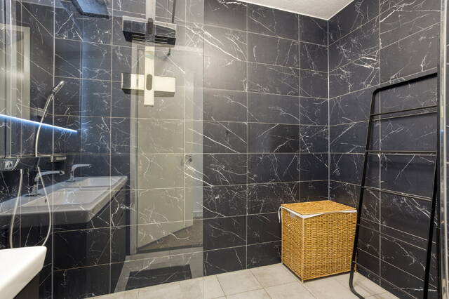 The bedroom offers calm and space, including a built-in workstation, and the layout allows for the creation of a second bedroom or home office. Additional storage is available next to the washing machine, handy for laundry and household essentials. The bathroom has a walk-in shower with rainfall showerhead and thermostatic tap, a double washbasin with vanity unit and drawers, and a heated towel rail. The separate toilet is fitted with a small sink and a bidet sprayer.