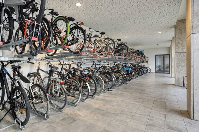 The apartment has a Beauview video doorbell with recording and review function. The building has a lift, an indoor bicycle storage room and a Bringme parcel box. The basement storage unit is approximately 6 m2 and offers ample storage space.